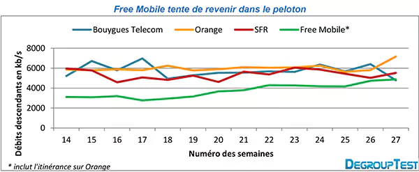 Depuis plusieurs semaines, Degrouptest note une amélioration progressive des débits chez Free ( 2 Mb/s en 12 semaines) et s’attend à une confirmation de sa progression au troisième trimestre 2013.