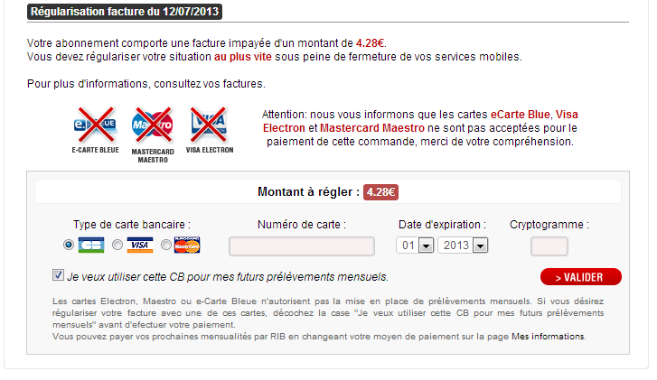 A noter que les e-carte les cartes maestro ou electron ne tolèrent pas le prélèvement automatique par carte bancaire. Il vous faudra alors décocher la case prélèvement automatique afin d’éviter un rejet.