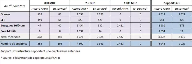 Plus généralement, l’ANFR rapporte que « s’agissant de la 4G, l’Agence a autorisé 4 500 sites dans la bande 2,6 GHz, en hausse de plus de 15 % sur un mois. 1 941 sont déclarés en service (+ 40 %). En outre, 583 sites ont reçu un accord de l’Agence pour la 4G en bande 800 MHz, en hausse d’environ 50 % par rapport aux chiffres de juillet. Enfin, en bande 1 800 MHz, 2 431 sites sont désormais autorisés pour la 4G (+ 166 % en un mois) »