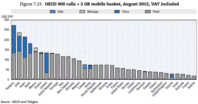 L’étude Arthur D. Little publiée en novembre 2012, intégralement disponible, montre que le prix d’une offre standard de téléphonie mobile (appels et SMS illimités, accès Internet jusqu’à 3 Go) est de 20€ par mois – contre 38€ en Grande-Bretagne, 42€ en Allemagne, 50€ en Italie et 67€ en Espagne.