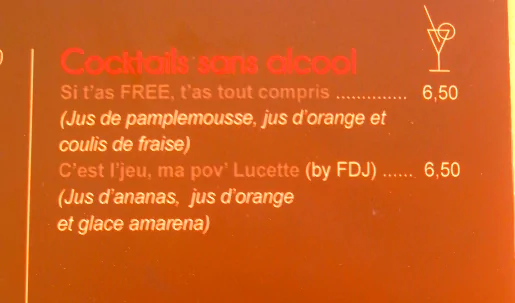 Les cocktails aux noms étranges sont monnaie courante sur la carte proposée par le bar. On retrouve également le "c’est l’jeu ma pov’Lucette" (by Française des jeux), le "Amaguiz"(by Jean Rochefort) ou le "What else (by George)."