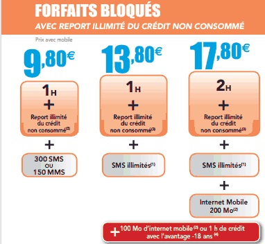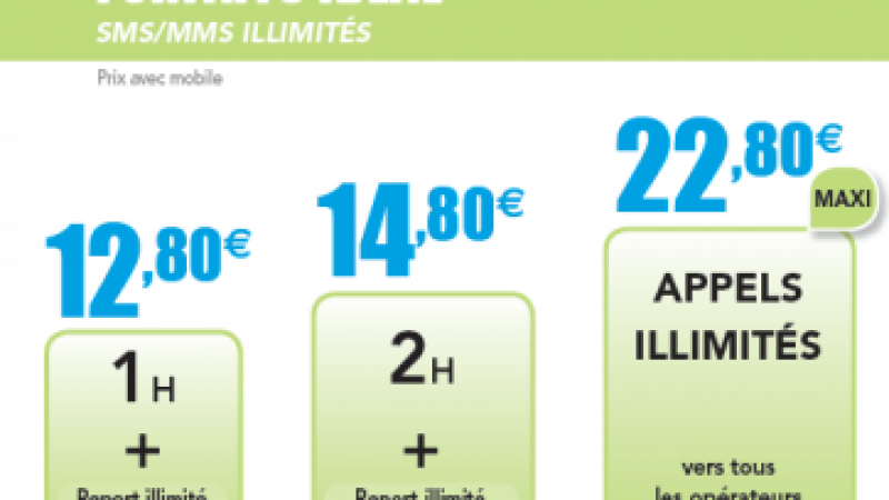 Coriolis rénove enfin ses forfaits bloqués 1h, 300SMS ou 150 MMS pour 9,80 €, 1h et SMS illimités pour 13,80 € et 2h, SMS illimités et Internet 200 Mo pour 17,80 €. Ils comprennent également un mobile à partir de 1 € et un engagement de 24 mois.