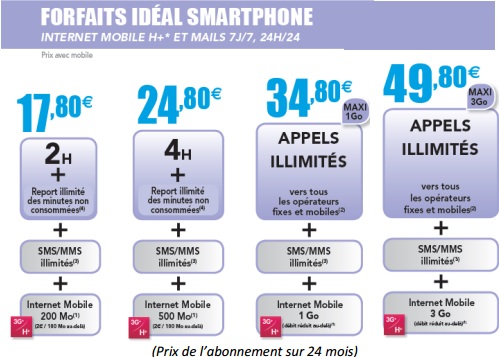 La gamme IDEAL Smartphone propose des forfaits entre 17,80 €/ mois à 49,80 €/ mois incluant de 2h de communications aux appels illimités et de 200 Mo à 3Go d’internet mobile en 3G+/H+.