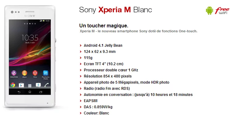 Encore des nouveautés sur la plateforme de vente de terminaux en ligne Free Mobile avec l’apparition du Sony Xperia M-Blanc 4 Go. Il fonctionne sous Android 4.1 Jelly Bean, dispose d’un écran 4’’ et d’un processeur double coeur 1 GHz. Il est égalament compatible EAP-SIM et permet donc de se connecter aux Hotspots Free Wifi.