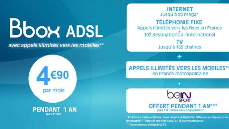 Comme le fait Free depuis plusieurs années, Bouygues Télécom lance aujourd’hui une vente privée. Celle-ci propose une série limitée Bbox ADSL (et également fibre) avec appels illimités vers les mobiles pour 4,90 euros pendant 1 an. Cette offre comprends :