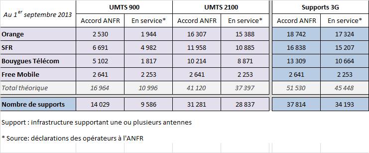 Le nombre total d’autorisations pour des sites de diffusion de service 3G s’établit à 37 814 au 1er septembre 2013, et apparaît ainsi globalement stable. Il s’élevait à 37 664 au 1er août dernier (+0,3% sur un mois). Free a obtenu 51 autorisations 3G supplémentaires, et a mis en service 46 antennes 3G supplémentaires, pour un nombre total de 2253 antennes activées au total.