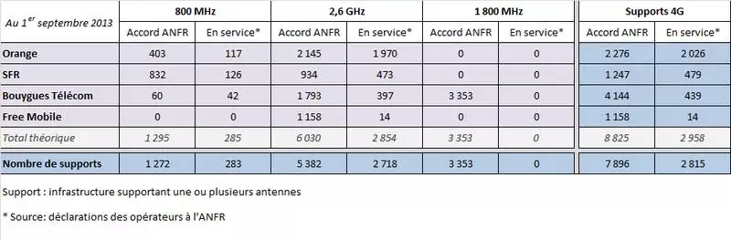 L’Agence nationale des fréquences vient de publier aujourd’hui les derniers chiffres de son observatoire mensuel des déploiements des réseaux 2G/3G et 4G. Au 1er septembre 2013, 7 896 sites ont été autorisés pour la téléphonie mobile très haut débit (4G) tous opérateurs confondus. Ce chiffre est en hausse de plus de 25% sur un mois.
