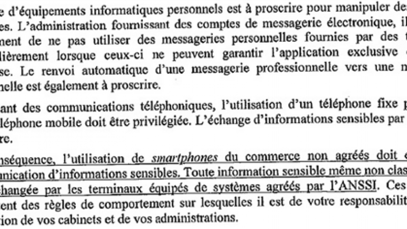Sur les "lignes non sécurisées" pour le transfert de données dites "sensibles", les ministres et leurs conseillers doivent utiliser un chiffrage de leurs données. L’usage d’équipement informatique personnel "est à proscrire" et les cabinets ministériels se voient rappeler les règles de base de l’anti-piratage à savoir " ne jamais laisser sans surveillance des documents sensibles, des ordinateurs, des téléphones portables", changer régulièrement leurs mots de passe, ne plus envoyer des dossiers sur leur Yahoo ou Gmail personnel…