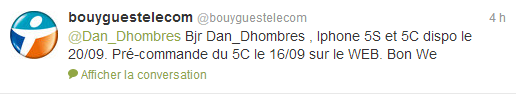 si une large communication est faite autour de l’iPhone 5C, aucun tarif n’est actuellement proposé. L’opérateur nous indique seulement que les "nouveaux iPhone arrivent bientôt. Aucune précommande n’est disponible. Il est pour le moment seulement possible de s’inscrire pour recevoir les offres quand elles apparaîtront. C’est sur twitter que Bouygues a révèlé que les précommandes ne seront disponibles que lundi 16 septembre.