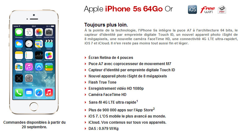 Outre l’iPhone 5C que free Mobile propose en précommande dès aujourd’hui, l’opérateur annonce également qu’il commercialisera l’iPhone 5S dans la boutique en ligne à compter du 20 septembre, date de sortie officielle. Trois couleurs seront proposées : Or, Argent et Gris Sidéral, en 3 modèles : 16 Go, 32 Go et 64 Go.