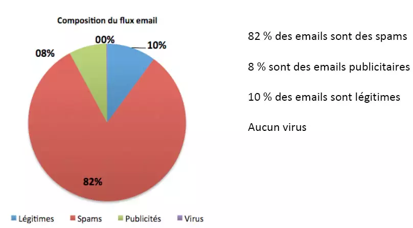 Vade Retro Technology, spécialisé dans la protection des messageries pour les FAI et les entreprises, a publié les statistiques du mois d’août en ce qui concerne les mails indésirables. Celles-ci sont basées sur l’étude de 200 000 boites mails valides qui représentent 8,5 millions de mails par jours. Il en ressort que 82% du flux email sont des spams et 8% des mails sont des publicités. Seuls 10% sont des emails légitimes.