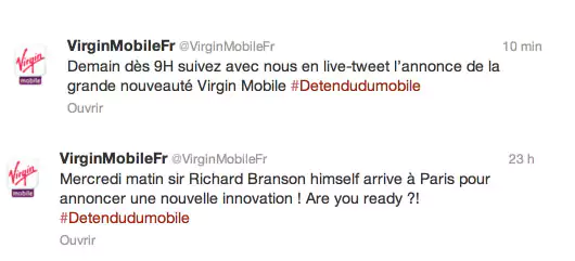 Virgin Mobile a annoncé aujourd’hui sur Twitter qu’il allait faire demain matin l’annonce d’une « grande nouveauté ». Pour l’occasion « sir Richard Branson himself arrive à Paris pour annoncer une nouvelle innovation ! » indique le MVNO