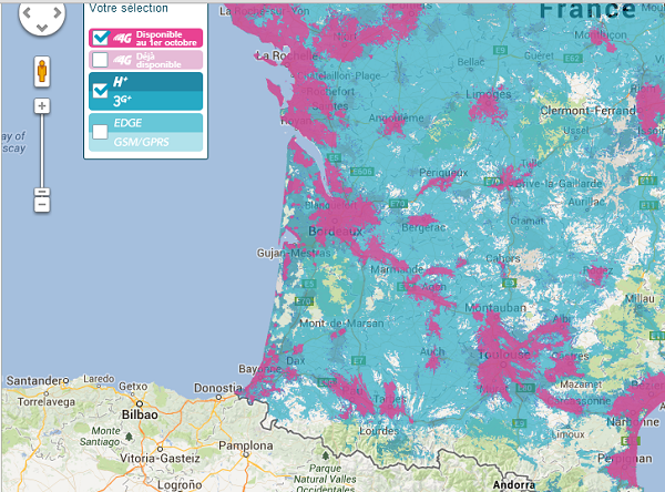 La carte de la couverture France entière n’étant pas accessible, voici les cartes du quart nord-ouest, nord-est, sud-ouest et sud-est. On peut s’apercevoir que les zones côtières sont beaucoup mieux desservies en 4G que l’intérieur du territoire. L’activation de cette 4G profitera donc surtout aux zones denses (et aux baigneurs) :