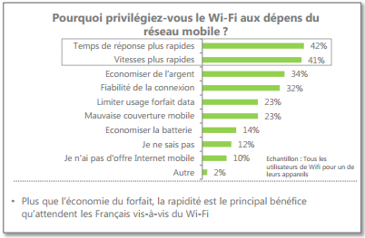 Pour les utilisateurs de mobile, l’usage du Wi-Fi répond plus à un besoin de rapidité que de réduction des coûts. Les utilisateurs recherchent un temps de réponse plus rapide(42%), un meilleur débit (41%), les économies sur leurs forfaits (34%) et la limitation de l’usage du forfait Data sont aussi des arguments fort. Reste également la qualité de la connexion, qui est considérée comme plus fiable par 32% des utilisateurs.