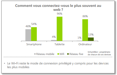 La conséquence logique l’usage d’internet sur mobile est effectué à 54 % sur un réseau Wi-Fi contre 46 % sur le réseau mobile.