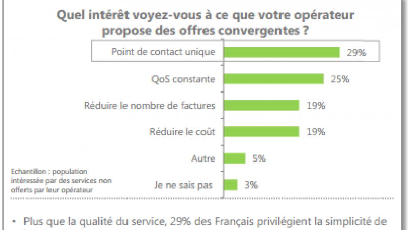 Le principal attrait pour ce type d’offre est la présence d’un point de contact unique pour le mobile et pour le fixe. "29% des Français privilégient ainsi la simplicité de la relation client" selon le cabinet.