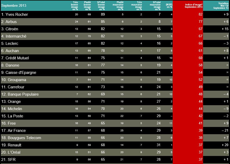 Les sondés ont dévoilé leur opinion en fonction de ce que les sondés ont entendu dire de l’entreprise au cours des derniers mois. Ont-ils une très bonne image, une plutôt bonne image, plutôt mauvaise image ou une très mauvaise image ? Si Yves Rocher, Airbus et Citroën briguent les trois premières places du classement, les quatre opérateurs de téléphonie se situent entre la 13ème place et la 21 ème place.