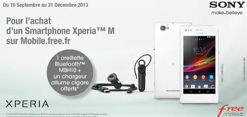 Une nouvelle offre promotionnelle est disponible sur la boutique en ligne Free Mobile. Pour tout achat d’un Sony Xperia M, une oreillette Bluetooth MBH10 et un chargeur allume cigare (d’une valeur de 39 euros) sont offerts. Le Xperia M est disponible au tarif de 199 euros en paiement comptant dans la boutique Free Mobile