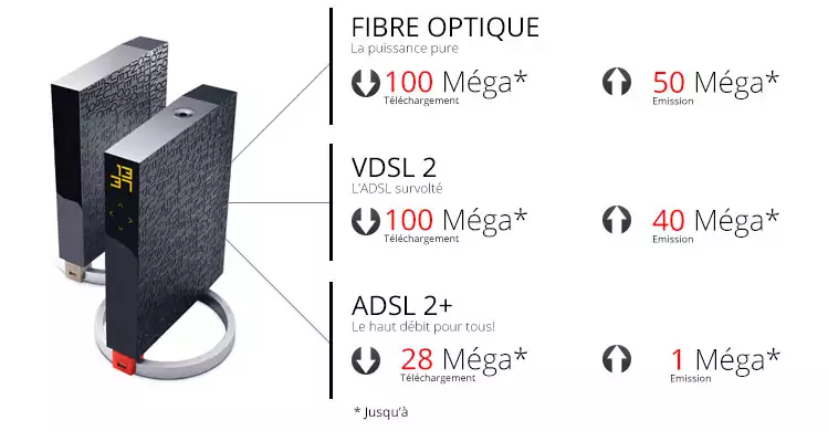 Pourtant, l’opérateur vient de faire disparaitre toutes mentions du VDSL 2. Sur la nouvelle page free.fr/adsl, mais également dans la rubrique internet qui présentait les débits du VDSL 2 depuis le mois de juillet dernier. Le terme VDSL 2 reste encore présent, mais il n’y a plus aucune information concernant cette technologie alors que ce tableau affichait 100 Méga en download et 40 en upload.