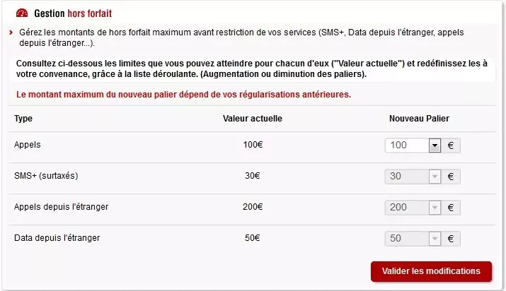 Cette option vous permet ainsi de modifier vos paliers au delà desquels vos services seront restreints, les petits budgets qui craignent une facture impayable pourront réduire leur palier, les gros consommateurs pourront ainsi les augmenter.