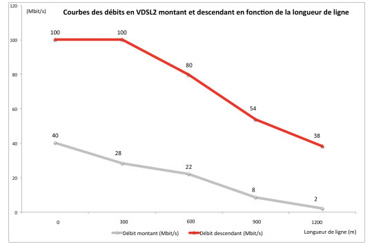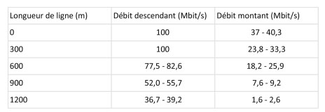 Débits moyens théoriques en VDSL2 constatés lors de tests sur les lignes en laboratoire.