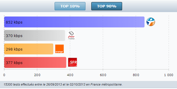 Ils relèvent également, les moyennes 10 % des tests mesurés comme les plus rapides en download par opérateur et le top 90 % des débits descendants.