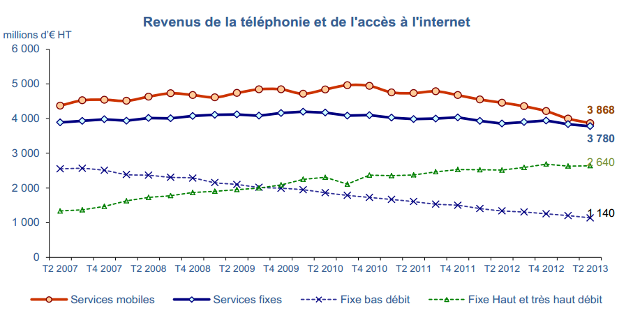 Les revenus des opérateurs ont, en revanche, baissé par rapport au trimestre 2012 de 2% dans le fixe, et de 13,2 % dans le mobile.