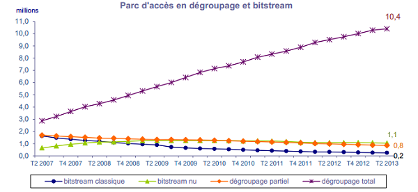 Dans le fixe, le nombre de lignes en dégroupage partiels baissent de 13,5 % à 844 000 lignes. Le nombre de lignes dégroupées augmente de 9,3 % par rapport au 2 ème trimestre 2012 avec 10,399 millions de lignes.
