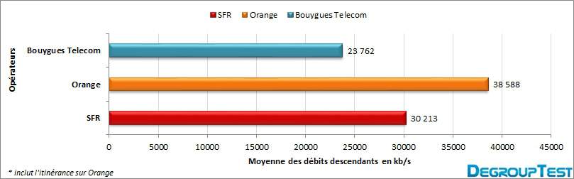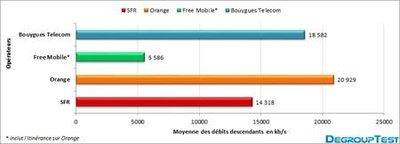 Concernant les opérateurs ces tests révèlent également des débits moyens descendant, en 4G seulement, largement inférieurs aux débits théoriques annoncés par les opérateurs. Ces tests, réalisés depuis l’entrée de Bouygues sur le marché de la 4G, place ce dernier entrant en dernière position (Free n’ayant pas lancé sa 4G), avec une moyenne de 23,7 Mbits en débit descendant, contre 30 Mbits pour SFR, et 38,5 Mbits avec Orange.