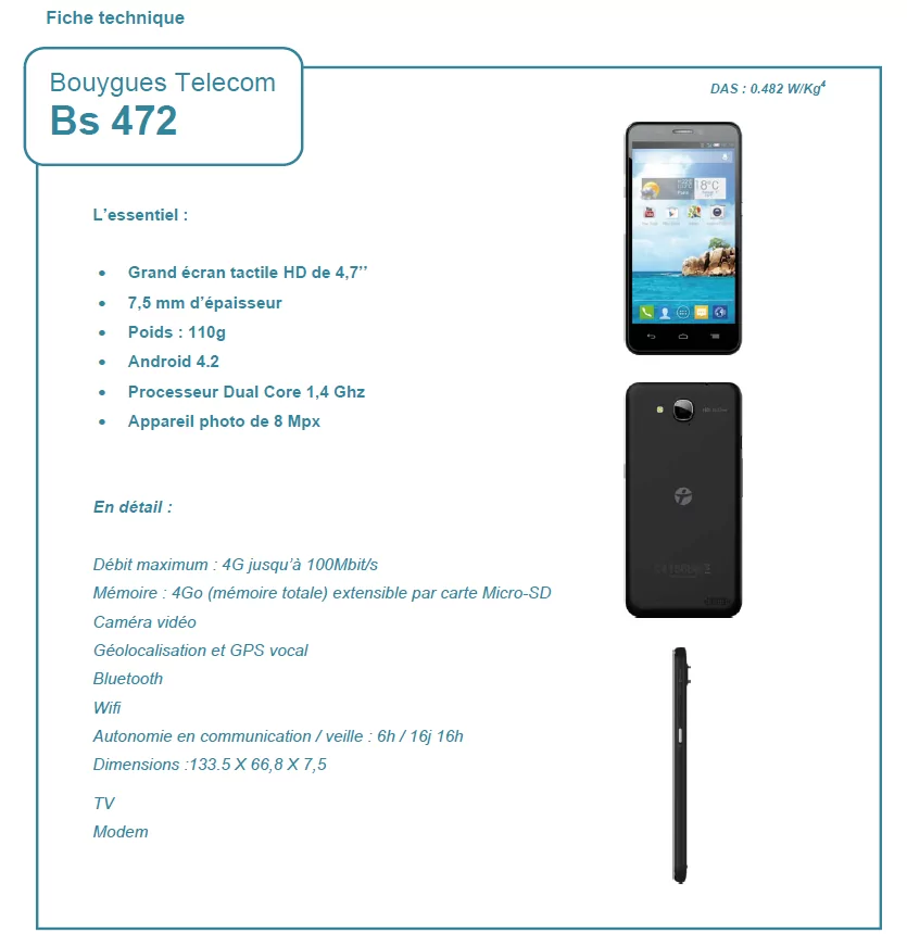 Bouygues Telecom a présenté aujourd’hui, le Bs 472, le dernier né de la gamme « à la marque » de l’opérateur. Ce Smartphone 4G ne sera pas vendu nu, mais avec un forfait ,au choix :