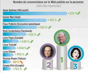 Le magazine 01Business a publié le classement des personnalités qui ont suscité le plus de commentaires sur le web durant les 2 dernières semaines. En première position on retrouve Steve Ballmer, dont la vidéo de ses adieux a beaucoup été commentée. Derrière lui, c’est Xavier Niel qui prend la deuxième place. Outre ses fonctions chez Free, c’est également son rôle dans l’école 42 et dans le futur incubateur numérique de Paris qui a beaucoup fait parler dans les 949 sites sur lesquels se base ce classement.