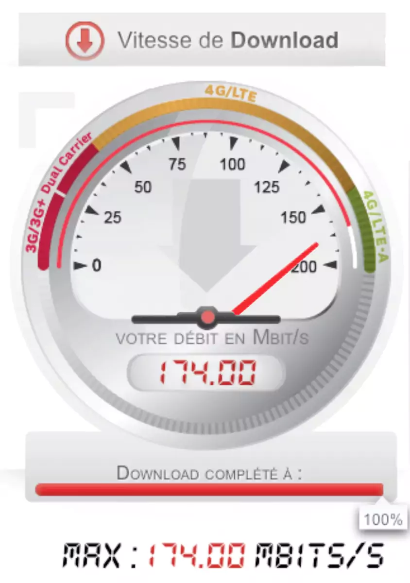 Cette expérimentation a permis de constater des débits réels de 174 Mbit/s en téléchargement (download).
