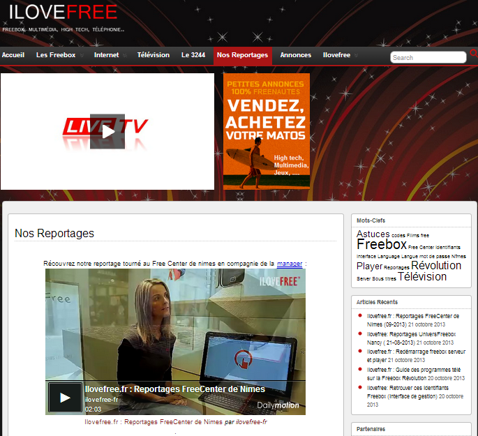 Univers Freebox vous en parlait il y a quelques mois, la chaîne de télévision Ilovefree.fr se lance officiellement ce jour. Chaine de télévision en flux continu, chaque reportage est également disponible en vidéo à la demande sur leur site. Réalisés par une équipe de professionnels de vidéos, l’objectif de cette webtv est de permettre aux Freenautes de découvrir tous les services proposés par Free, Free Mobile ou la Freebox à travers des tutoriels, des émissions ou encore des reportages.