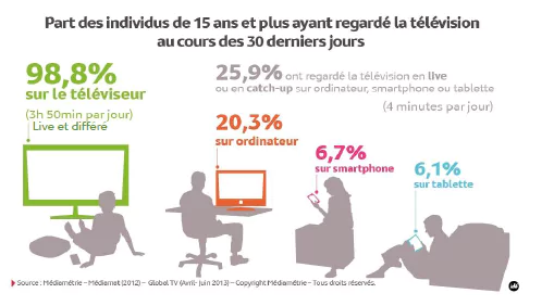 Si 98,8% des téléspectateurs de plus de 15 ans sont toujours accroc au petit écran traditionnel en moyenne pendant 3h50 par jour et par personne, ils consacrent 4 min par jour à regarder des programmes TV en direct ou en Catch-Up sur d’autres terminaux comme les PC, tablettes ou smartphones.