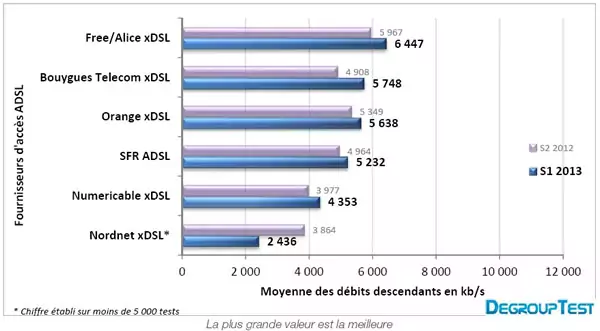 Pour le premier semestre 2013, Orange passe en tête avec un débit montant de 771 kb/s devant Free/Alice dont les connexions affichent un débit montant moyen de 708 kb/s (valeur inchangée par rapport au deuxième semestre 2012). SFR reste stable avec un débit montant de 640 kb/s. Le débit moyen obtenu avec les connexions Bouygues Telecom s’établit à 627 kb/s suivi par Numericable avec 566 kb/s.