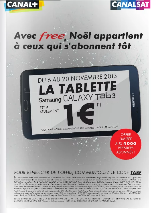 Cette offre ne concerne que les 4000 premiers abonnés entre le 06 et 20 novembre. Elle exclue également toute les personnes abonnées ou ayant été abonnées au cours des 6 derniers mois. Pour recevoir votre tablette, il vous faudra renvoyer votre contrat signé par Canal+ et passer votre commande sous 10 jours selon les modalités figurant sur le contrat d’abonnement.