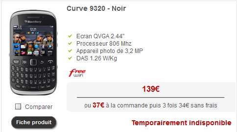 Le Blackberry Curve 9320 à 139 € ne peut pas non plus être commandé pour le moment. L’arrivée du 9720, la semaine dernière pourrait être un indicateur de sa prochaine disparition définitive.