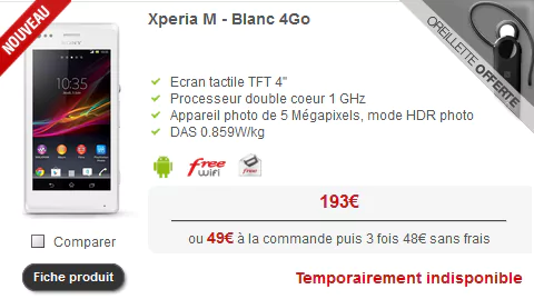 Le Sony Xperia M, habituellement au tarif de 193 € est pour le moment "temporairement indisponible" tout comme le Sony Xperia SP , le téléphone compatible 4G, vendu 309 €, n’est plus disponible à la commande pour le moment.