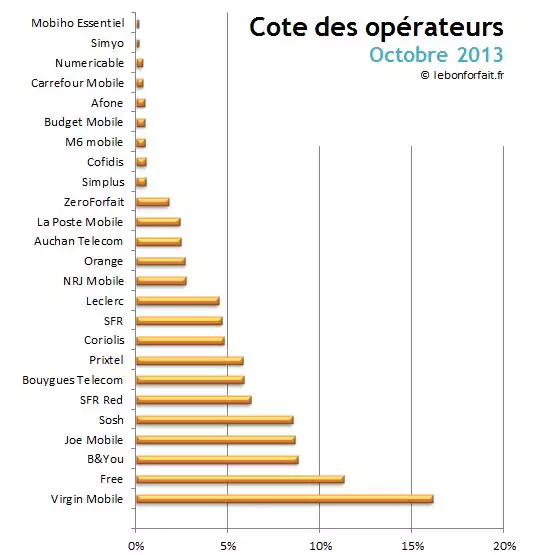 Après une rétrogradation à la troisième place derrière SFR le mois dernier, Free repasse deuxième juste derrière Virgin Mobile. Le Full MVNO a toujours le vent en poupe avec 16 % des consultations, grâce à son forfait Idol 2H-1Go sans engagement à 9,99 €/mois.