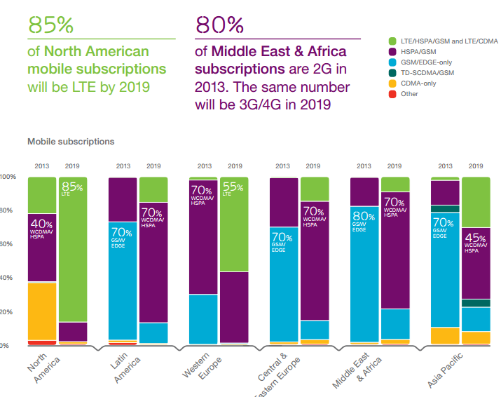 Concernant l’Europe, Ericsson prévoit, en 2019, 55% des connexions à l’Internet mobile en technologie LTE en Europe de l’Ouest et plus de 70 % en HSPA/WCDMA en Europe de l’Est et Europe Centrale. En comparaison, à cette même date Ericsson prévoit 85 % des connexions mobiles en LTE en Amérique du Nord.