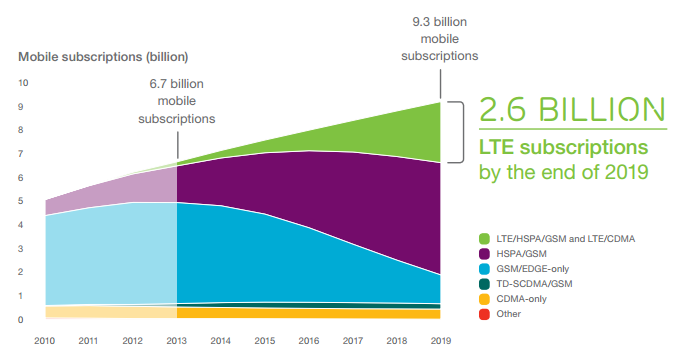 Selon un rapport de l’équipementier Ericsson pour le troisième trimestre 2013, d’ici 2019, il y aura 5,6 milliards d’utilisateurs de smartphone, PCs et tablettes connectés à l’Internet mobile et 9,3 milliards d’abonnements à l’Internet mobile soit près de 90 % de la population mondiale. A ce jour, Ericsson comptabilise seulement 1,9 milliard d’abonnés à l’Internet mobile.