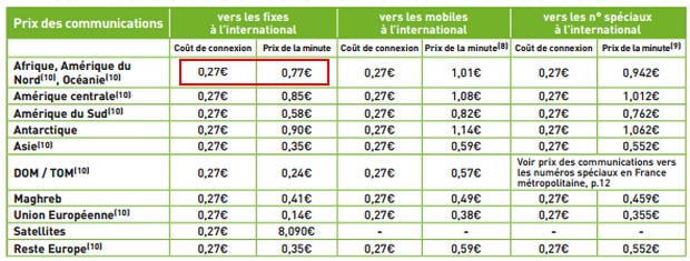 Le tarif de la communication à la minute augmente également de 0,05 €/minute pour les communications vers les fixes d’Afrique, d’Amérique du Nord et d’Océanie, et de 0.068 € pour les communications vers les mobiles de ces mêmes destinations.