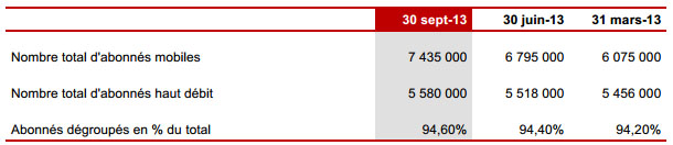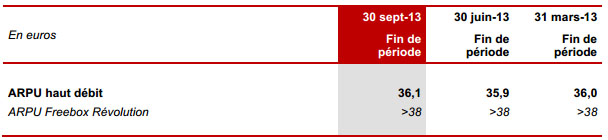 Iliad annonce également une hausse de l’ARPU haut débit qui progresse de 0,30 euro par rapport au 3ème trimestre 2012 pour atteindre un niveau proche de son niveau historique à 36,10 euros au 30 septembre 2013. Cette évolution s’explique principalement par le succès de l’offre Freebox Révolution, dont l’ARPU se maintient à plus de 38 euros sur la période.