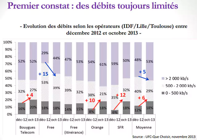 L’UFC Que Choisir a regroupé toutes ses mesures pour comparer chaque opérateur et les a comparé avec sa précédente étude de décembre 2012. Ce graphique montre les « taux de non Qualité » (TNQ) moyens pour l’ensemble des services flux descendants, pour des débits supérieurs à 2 000 kb/s