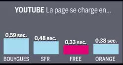 Il en ressort que c’est Orange qui affiche le temps de chargement moyen le plus faible avec 0,8 seconde, alors que Free est plus irrégulier, mais se classe en première position sur 3 de ces 5 sites. C’est notamment le cas avec YouTube où Free ne met que 0,33 sec pour afficher la page, le meilleur temps du classement. Surtout, Directique précise que Free est « excellent sur YouTube, y compris en débit ».