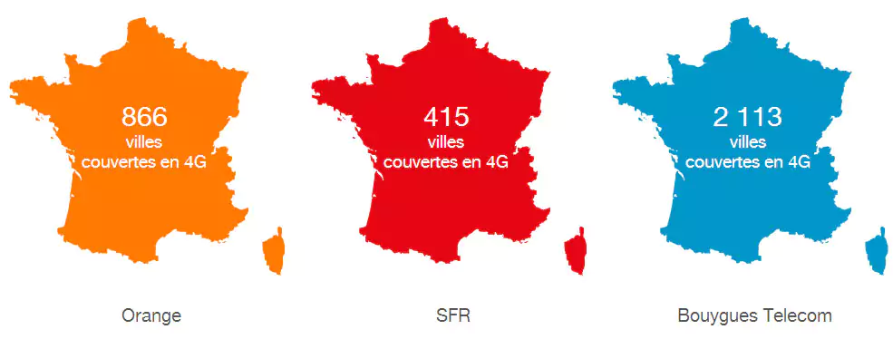 Orange annonce sur son site quialameilleure4g.com qu’il couvre désormais 866 villes en 4G, contre 595 deux semaines plus tôt, comme le note Ariase. Une augmentation importante mais qui laisse l’opérateur historique toujours loin derrière Bouygues Télécom qui annonce couvrir 2113 villes en 4G. SFR, qui avait été le premier à lancer la 4G, est quant à lui à la traîne avec seulement 415 villes annoncées comme couvertes en 4G.