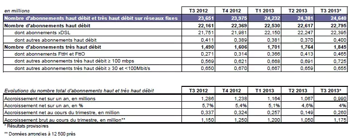 Au 30 septembre 2013, la France compte au total 24,6 millions d’abonnements en hausse de 1 million sur un an, haut débit et très haut débit confondu.
