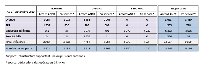 Autorisations et activations d’antennes 4G au 1er novembre 2013