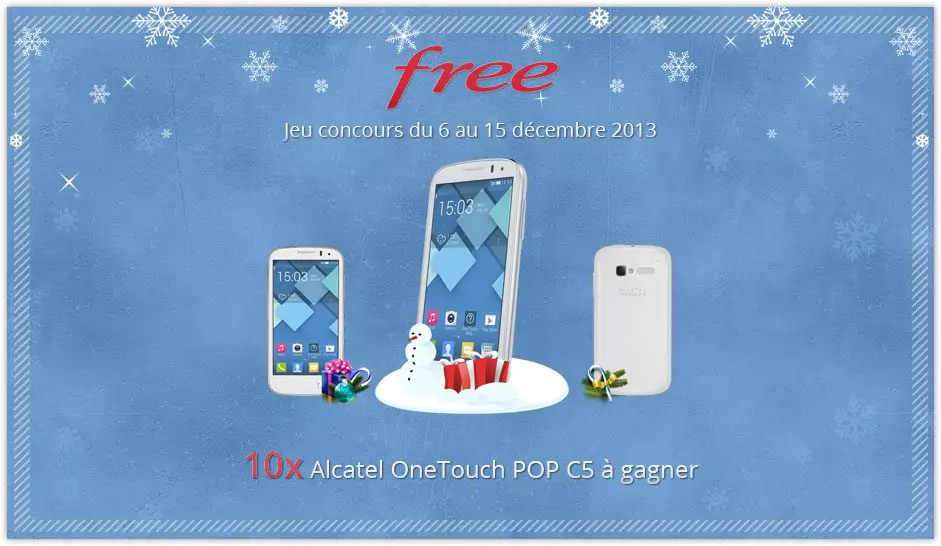 Sur les réseaux sociaux, Free annonce que dès aujourd’hui, un nouveau jeu concours permettra de gagner 10 smartphones. En jeu 10 terminaux Alcatel One Touch Pop C5 d’une valeur de 99 € sont à gagner.