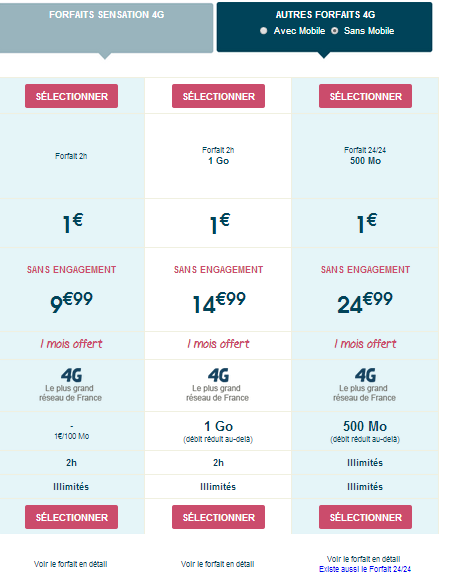 Si pour les forfaits Sensation qui proposaient déjà la 4G, il n’y a aucun changement, ce sont des forfaits à petits prix qui intègrent désormais la 4G à partir de 9,99 € sans engagement.